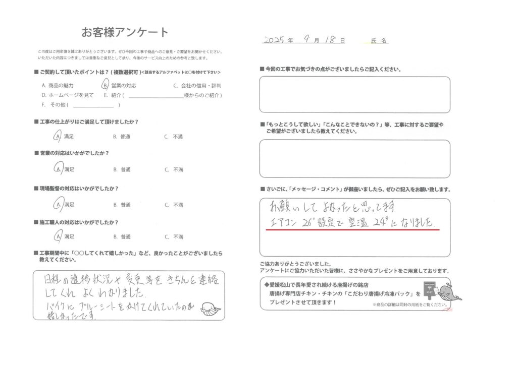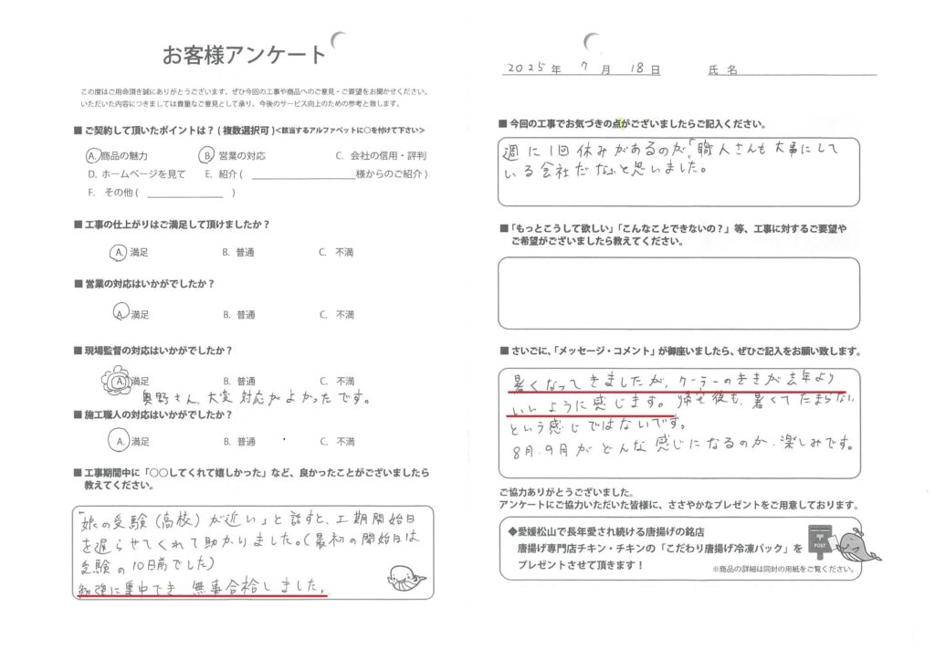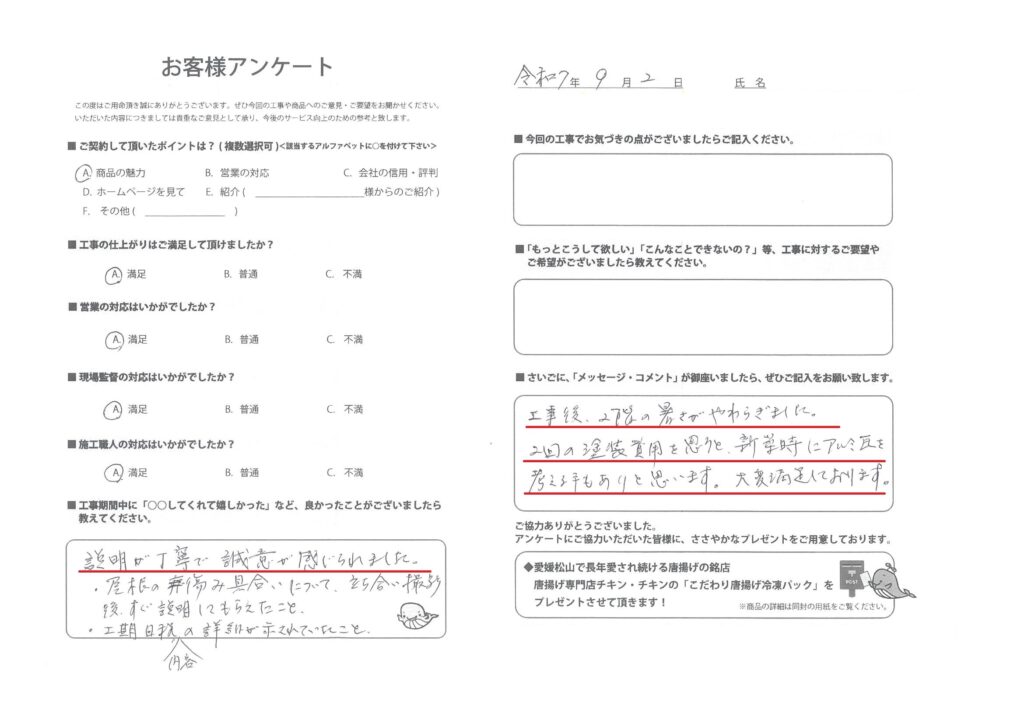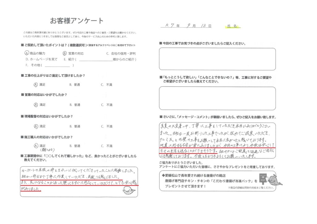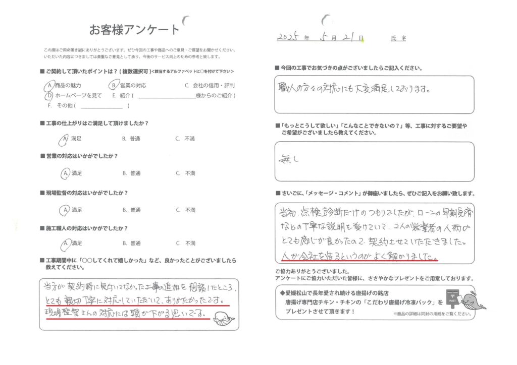 弊社では、より良いサービスを目指して、工事をご依頼いただいたすべてのお客様に、施工内容や商品についてのご意見・ご感想をお願いしております。